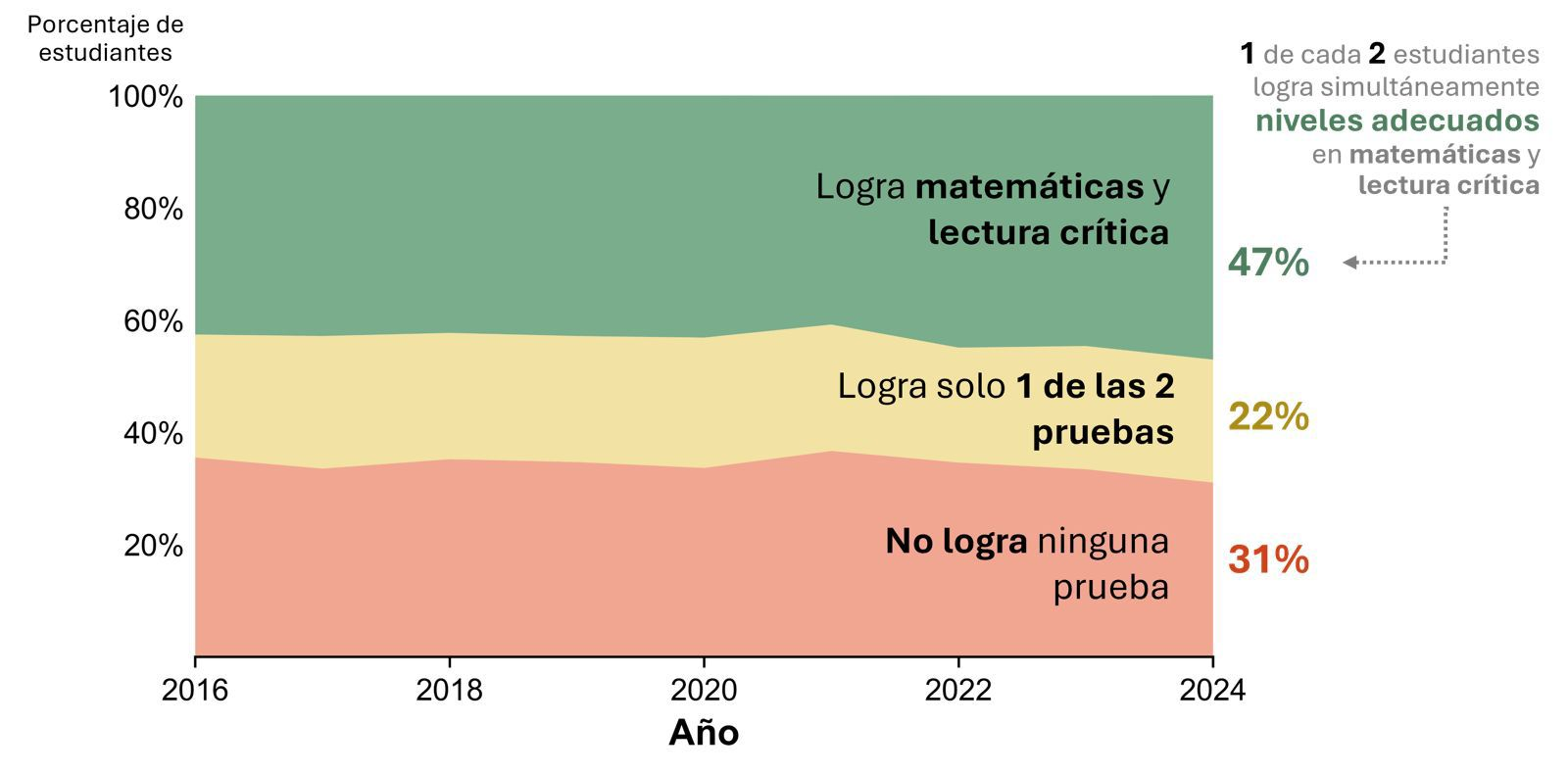 Las cifras muestran que la proporción de estudiantes que alcanzan un nivel adecuado en matemáticas y lectura crítica se ha mantenido estable en los últimos años, con ligeras mejoras tras el impacto negativo de la pandemia por el Covid-19.
