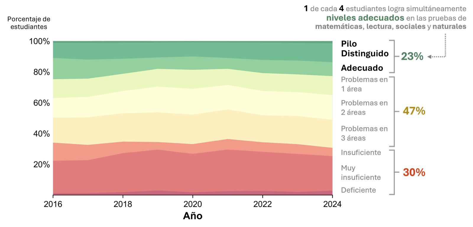 El 30 % de los estudiantes en grado 11° no alcanza niveles satisfactorios en ninguna de las cuatro áreas evaluadas. El informe subraya que muy pocos jóvenes logran un nivel de preparación integral al término de la educación media, lo que limita sus oportunidades futuras para acceder a la educación posmedia o insertarse en el mercado laboral.