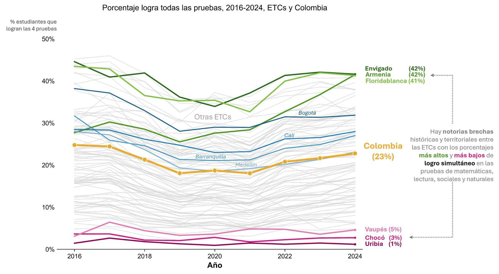 Los datos revelan brechas profundas en la calidad educativa, tanto a nivel nacional como territorial. El análisis por Entidad Territorial Certificada (ETC) evidencia que, mientras en municipios de la región andina como Envigado y Armenia cerca del 40 % de los estudiantes alcanzan niveles adecuados en las cuatro áreas, en territorios como Chocó y Uribia (La Guajira) menos del 3 % de los jóvenes logra este desempeño.