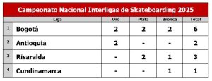 Bogotá consiguió el título del Campeonato Nacional Interligas de Skateboarding, el primero que se realiza en la historia del deporte olímpico del patinaje sobre ruedas. Bogotá ganó 2 medallas de oro, 2 de plata y 2 de bronce, superando a Antioquia (2 oros), que fue segunda, y a Risaralda (2 platas – 1 bronce).