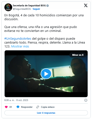 La Alcaldía Mayor de Bogotá y la Policía de Bogotá lanzaron la campaña «Un segundo antes», buscando reducir los hechos de intolerancia que desencadenan tragedias. Esta iniciativa surge porque, en promedio, cuatro de cada diez homicidios en la ciudad comienzan con una riña, una ofensa o un malentendido que podrían haberse evitado. Situaciones tan cotidianas como una mala palabra, una discusión entre vecinos o un conflicto de pareja escalan en muchos casos a tragedias irreparables. Por consiguiente, la ofensiva contra el homicidio en la capital requiere el apoyo ciudadano para controlar las emociones y detener las reacciones violentas.