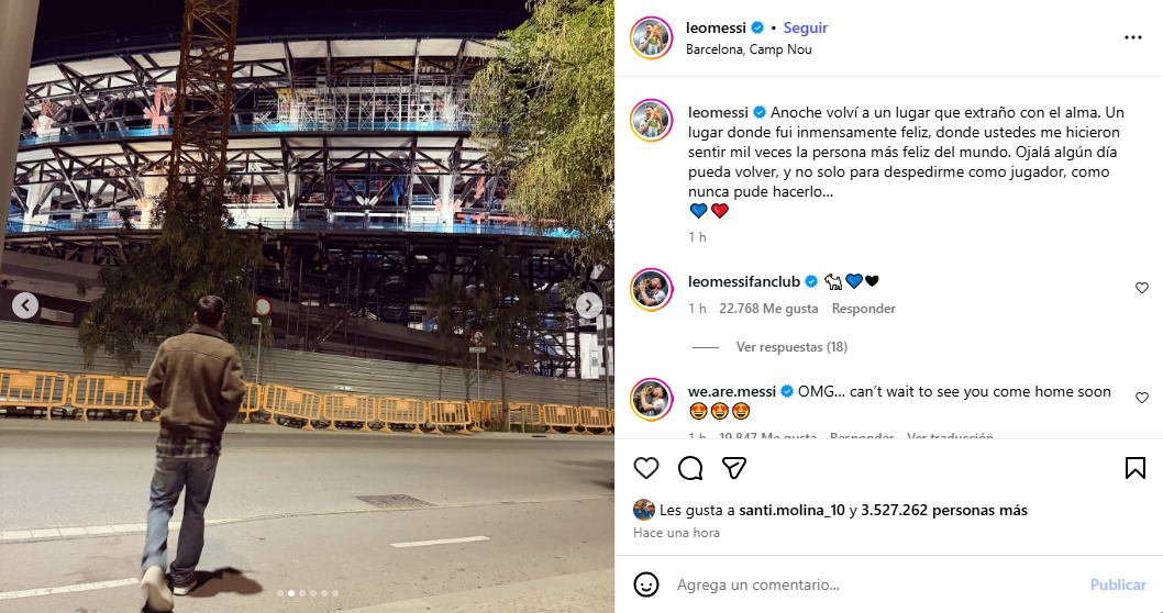 Lionel Messi sorprendió este lunes con una publicación que conmovió a los hinchas del Barcelona. Desde el remodelado Camp Nou, el astro argentino compartió un mensaje lleno de sentimiento en el que expresó su deseo de regresar algún día al estadio que marcó su carrera.