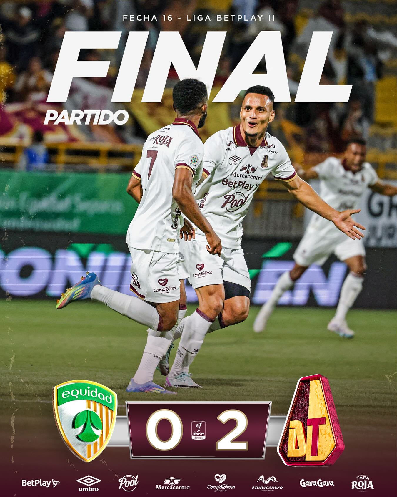 Deportes Tolima consiguió una victoria contundente por 0-2 en su visita a La Equidad por la jornada 16 del Torneo Clausura. El equipo dirigido por