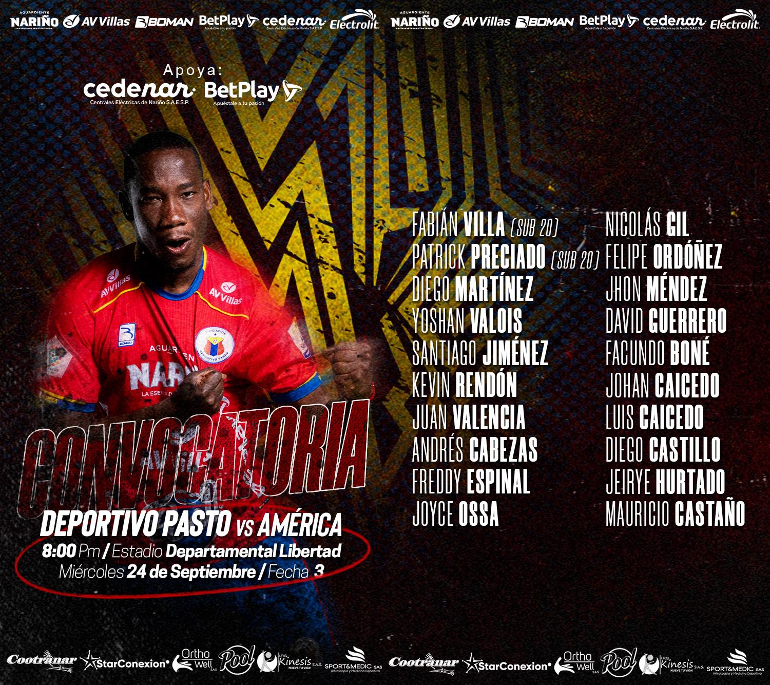 Deportivo Pasto presentó su lista de convocados para el compromiso de esta noche frente a América de Cali en el estadio Departamental Libertad, un duelo correspondiente a la tercera fecha de la Liga BetPlay. El conjunto nariñense afronta el reto con una nómina variada, donde figuran jugadores de experiencia y también talentos jóvenes que buscan consolidarse.