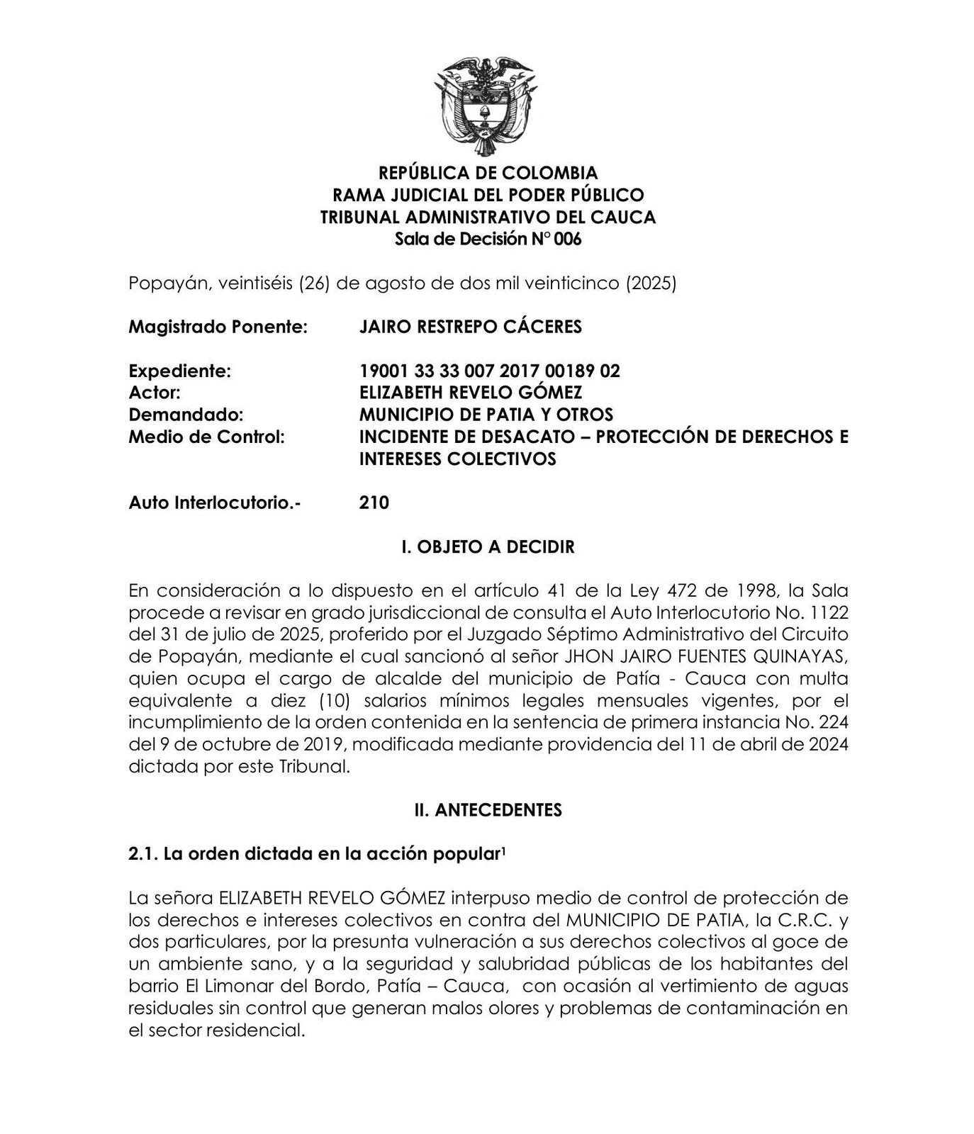 Un nuevo fallo del Tribunal Administrativo del Cauca dejó sin efecto la sanción económica que pesaba sobre el alcalde del municipio de Patía, Jhon Jairo Fuentes Quinayas, en el marco de una acción popular interpuesta en relación con la problemática ambiental del barrio El Limonar en El Bordo.