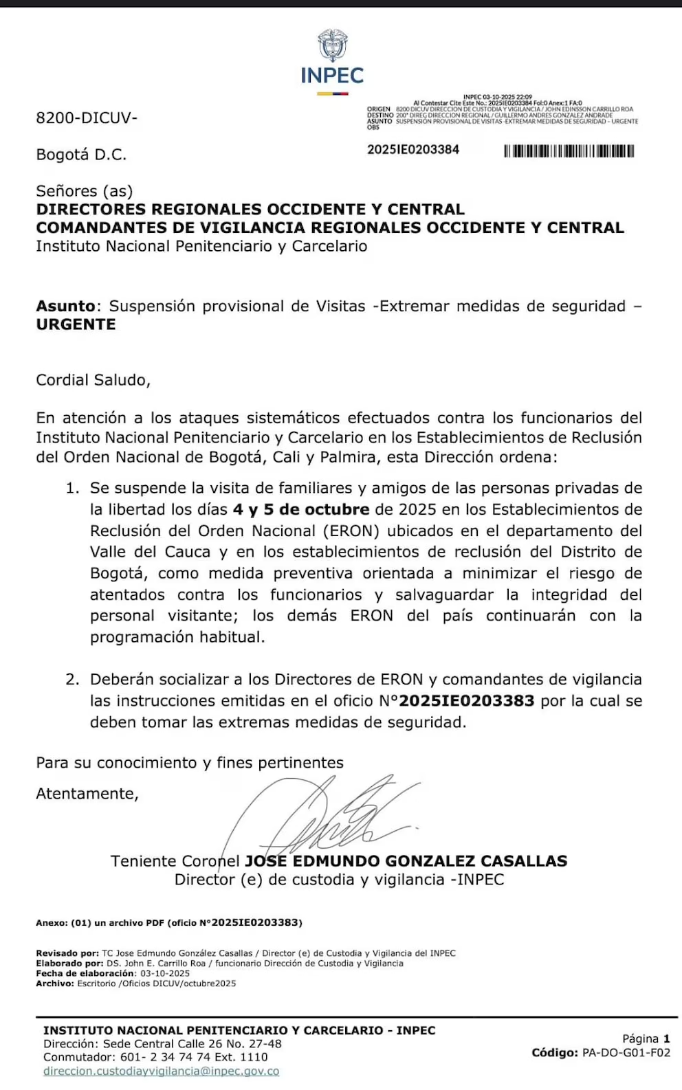 Ante la ola de ataques, el Gobierno nacional adoptó medidas excepcionales de seguridad. Entre ellas, la suspensión de visitas a los internos durante los días 4 y 5 de octubre en los establecimientos de reclusión del orden nacional ubicados en Bogotá y el Valle del Cauca.